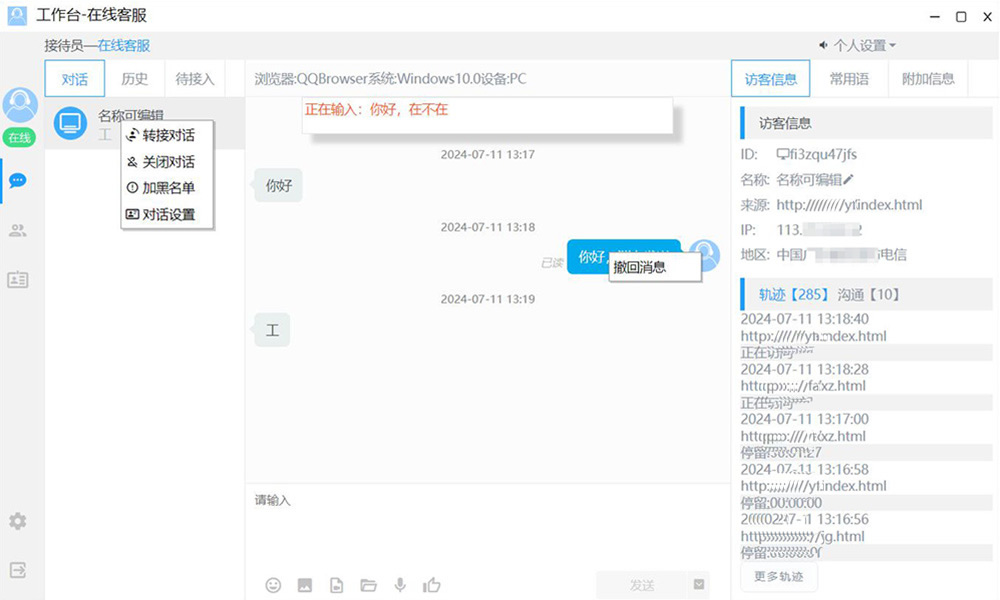 客服转接、历史消息查看、数据统计、来源追踪、问候语、访客等...